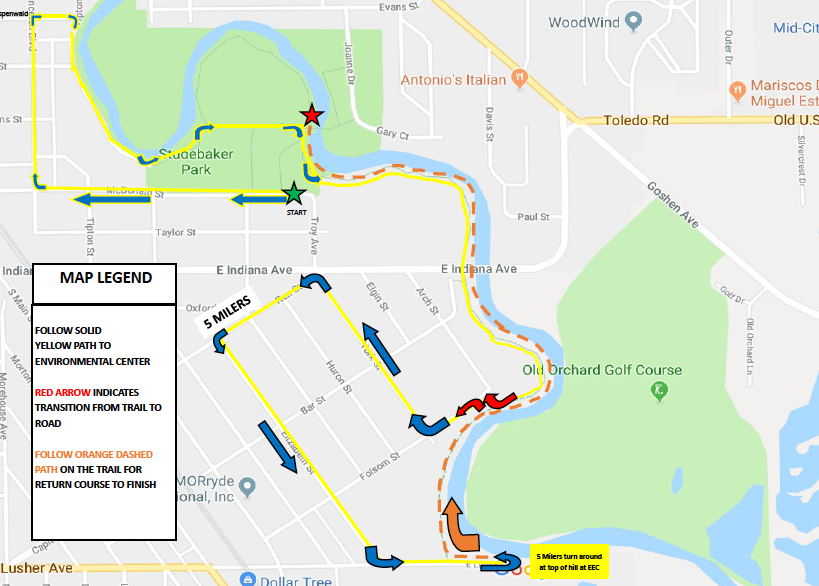 Join us for the Annual Frosty Five Run which includes a choice of a 5 Mile option as well as a 5K. The Five Mile course has added the 1.9 mile extra portion at the front end of the run so that once you are on the path, there are no other deviations. Enjoy the scenic course that starts at Studebaker Park Pavilion and follows the River Greenway Trail along the Elkhart River.